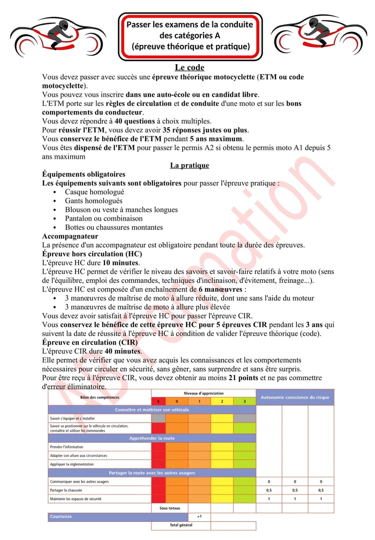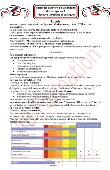 Les permis A1 et A2 sont des catégories de permis moto. Pour ces catégories un examen théorique spécifique (ETM) est nécessaire.